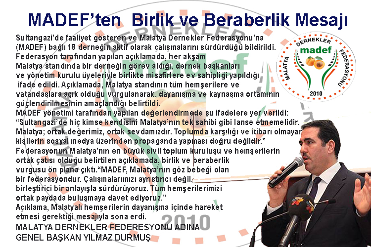 Sultangazi’de faaliyet gösteren Malatya Dernekler Federasyonu (MADEF) Genel Başkanı Yılmaz Durmuş, federasyonun çalışmaları ve kamuoyunda yapılan bazı değerlendirmelere ilişkin önemli açıklamalarda bulundu.