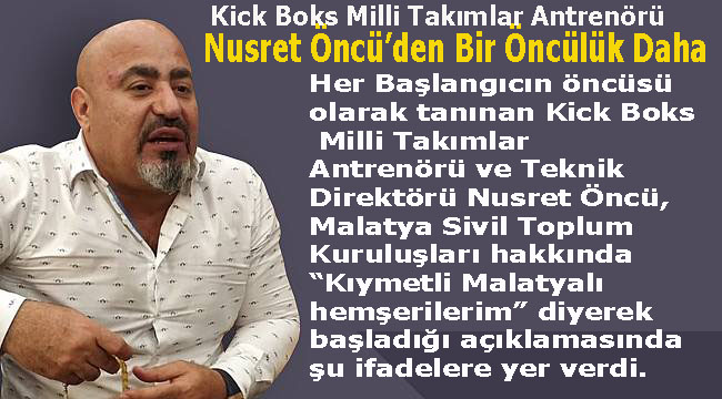 Her Başlangıcın öncüsü olarak tanınan Kick Boks Milli Takımlar Antrenörü ve Teknik Direktörü Nusret Öncü, Malatya Sivil Toplum Kuruluşları hakkında “Kıymetli Malatyalı hemşerilerim” diyerek başladığı açıklamasında şu ifadelere yer verdi.