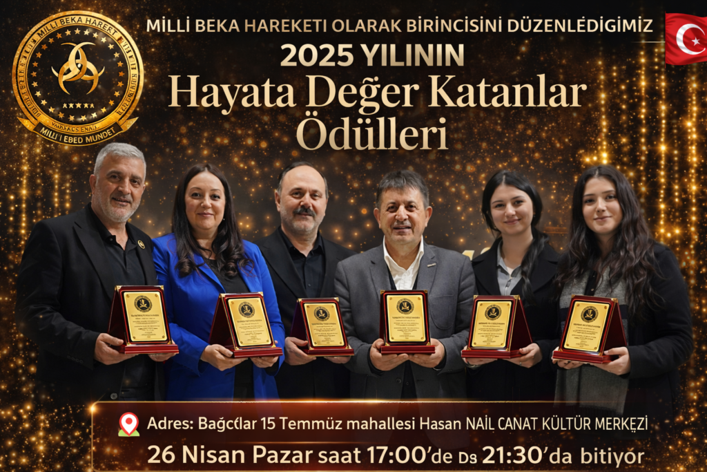 Milli birlik ve beraberlik vurgusuyla faaliyetlerini sürdüren Milli Beka Hareketi, önemli bir organizasyona imza atmaya hazırlanıyor. Bu yıl ilk kez düzenlenecek olan “2025 Yılı Hayata Değer Katanlar Ödülleri”, 26 Nisan 2026 Pazar günü İstanbul Bağcılar’daki Hasan Nail Canat Kültür Merkezi’nde gerçekleştirilecek.